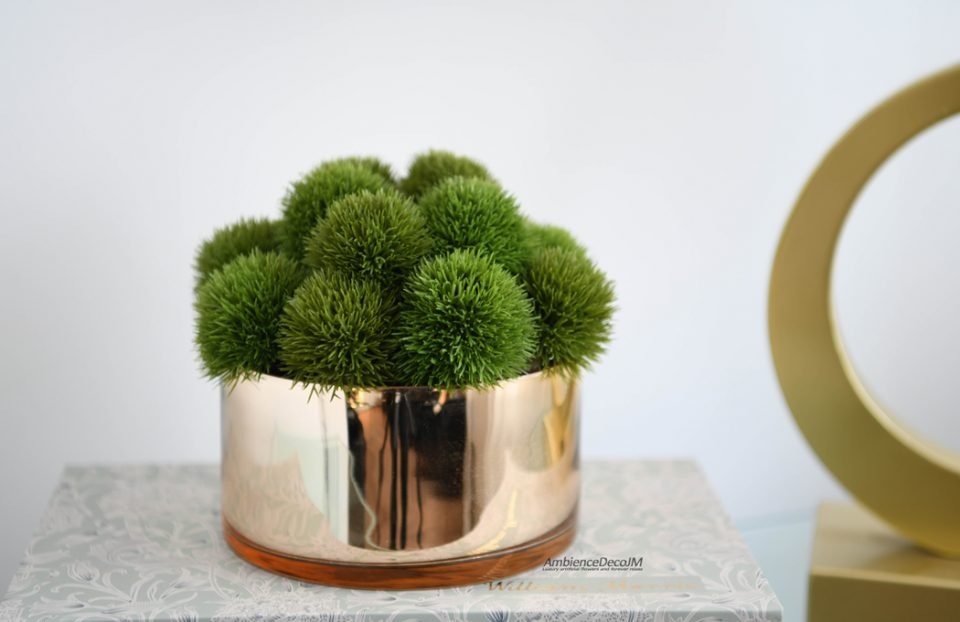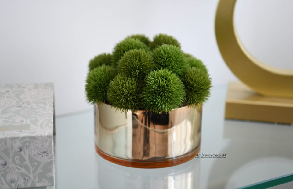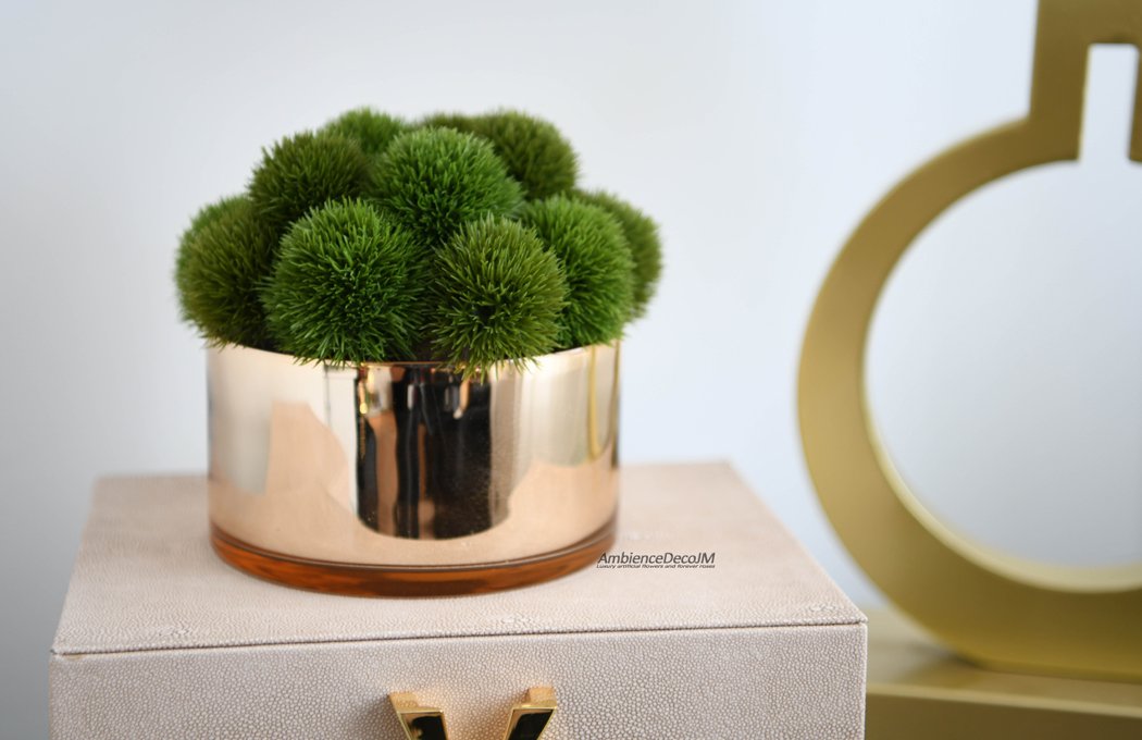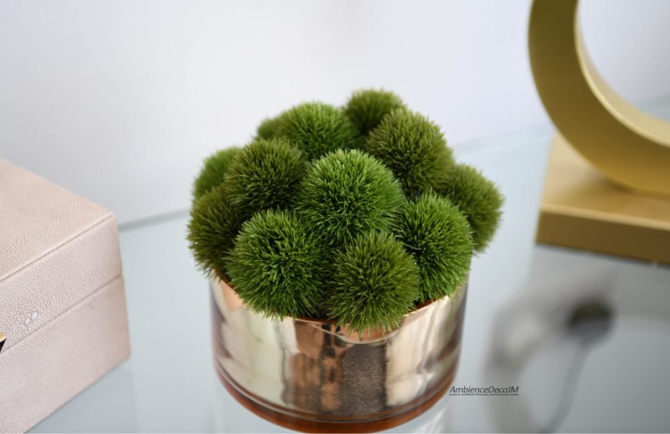 This contemporary green floral arrangement features a realistic faux dianthus placed in a modern glass container. (Please specify if you prefer a silver or gold bowl.) This unique and elegant artificial green arrangement is perfect for decorating offices, kitchens, or bathrooms. It’s a stylish way to add a touch of greenery to your interior.