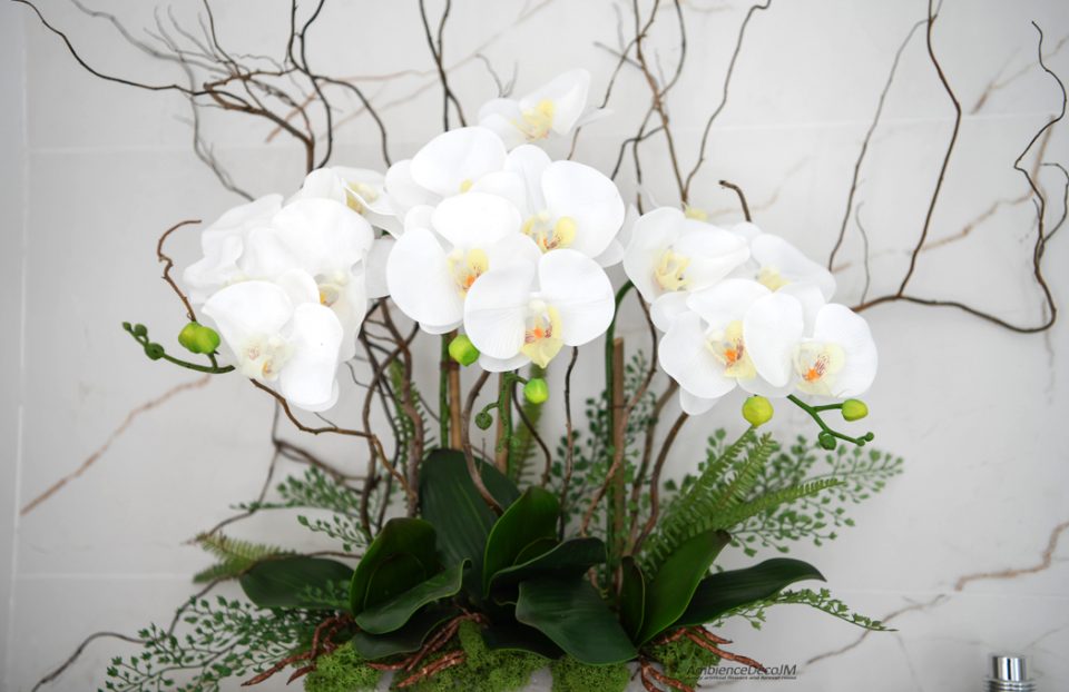 Ideal for lobbies, kitchen islands, console tables, side tables, or bathrooms, these real-touch orchids require minimal maintenance while maintaining their beauty all year round.